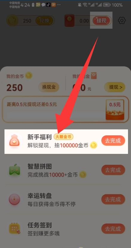 首页点右上角(提现)-点(新人福利)-领取所有福利-去提现0.5元